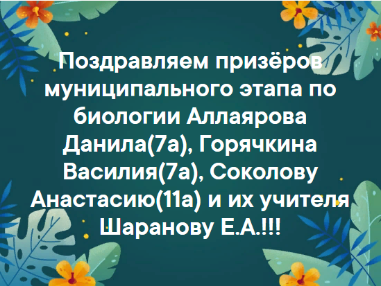 Поздравляем призёров муниципального этапа по биологии Аллаярова Данила(7а), Горячкина Василия(7а), Соколову Анастасию(11а) и их учителя Шаранову Е.А.!!!