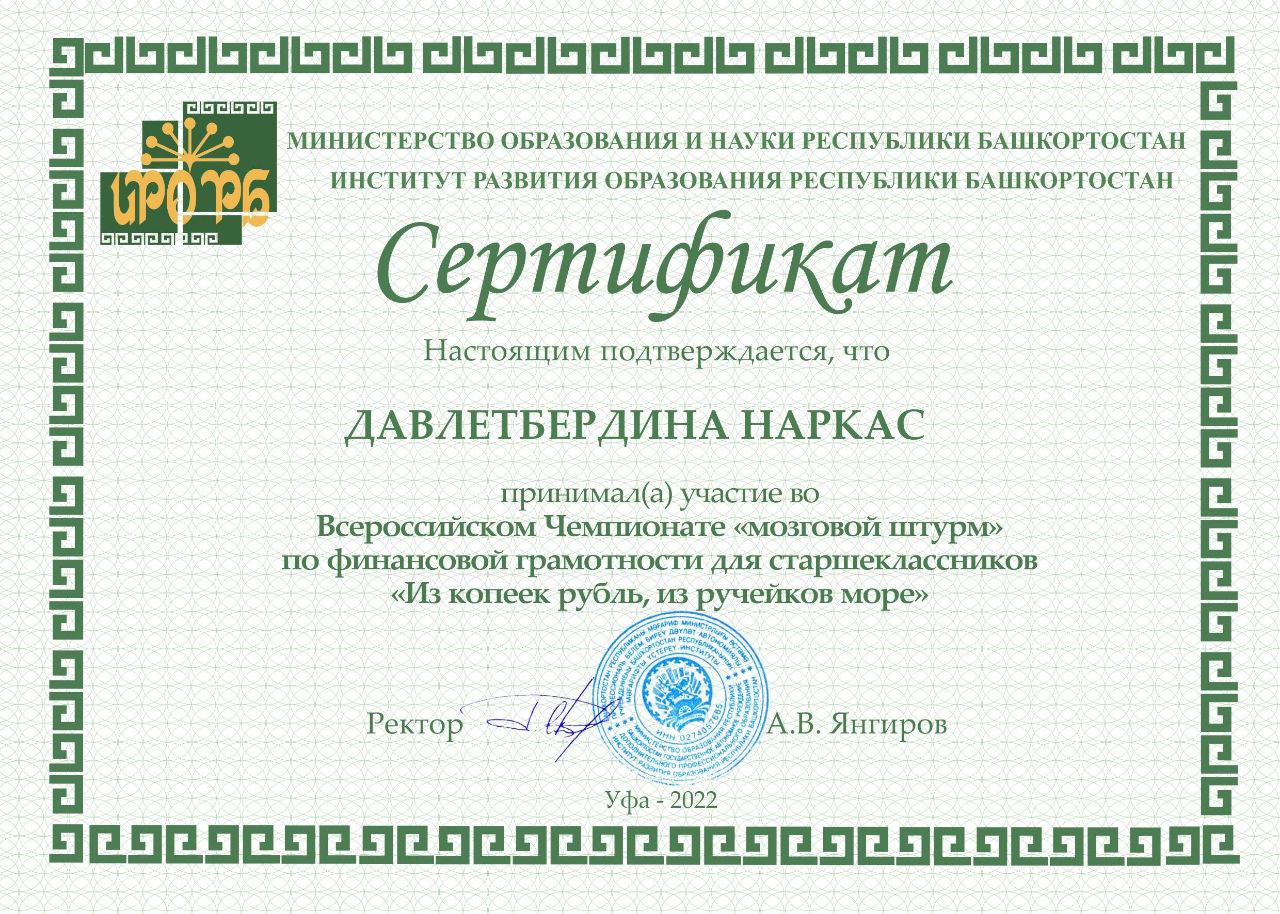 Таблица результатов Всероссийского Чемпионата «мозговой штурм» по финансовой грамотности для старшеклассников «Из копеек рубль, из ручейков море»: https://ufarmc.irorb.ru/wp-content/uploads/mozg2022/rez.pdf